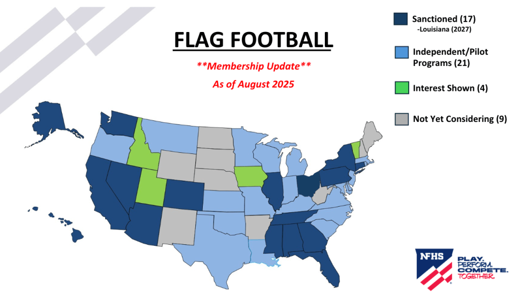 As of today, 38 states are offering girls high school flag football programs with 17 states that have officially state sanctioned championships.3